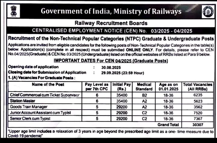 The Railway Recruitment Board (RRB) has officially announced the RRB Recruitment 2025, releasing a massive notification to fill 30,307 NTPC posts across various zones of Indian Railways. This recruitment includes roles such as Station Master, Typist, Goods Train Manager, Junior Account Assistant, Chief Commercial Ticket Supervisor, and Senior Clerk.